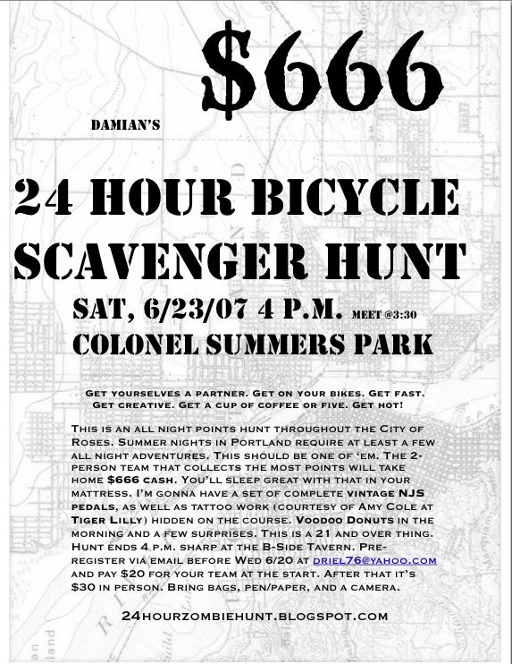 4 wheels are pure evil, unless it's two bikes! Then it's fun as Hell. You'll be be nearing full zombiedom by the end of this all nighter(you were gonna stay up all night anyway, right?). $666 cash to the TWO PERSON TEAM who trudges in with the most points. Secret prizes(vintage track pedals, $125 of tattoo work from Amy Cole at Tiger Lily, Voodoo Donuts) hidden on course, as well as surprise chances to get bonus points. Register your team name(2 words) via email at driel76