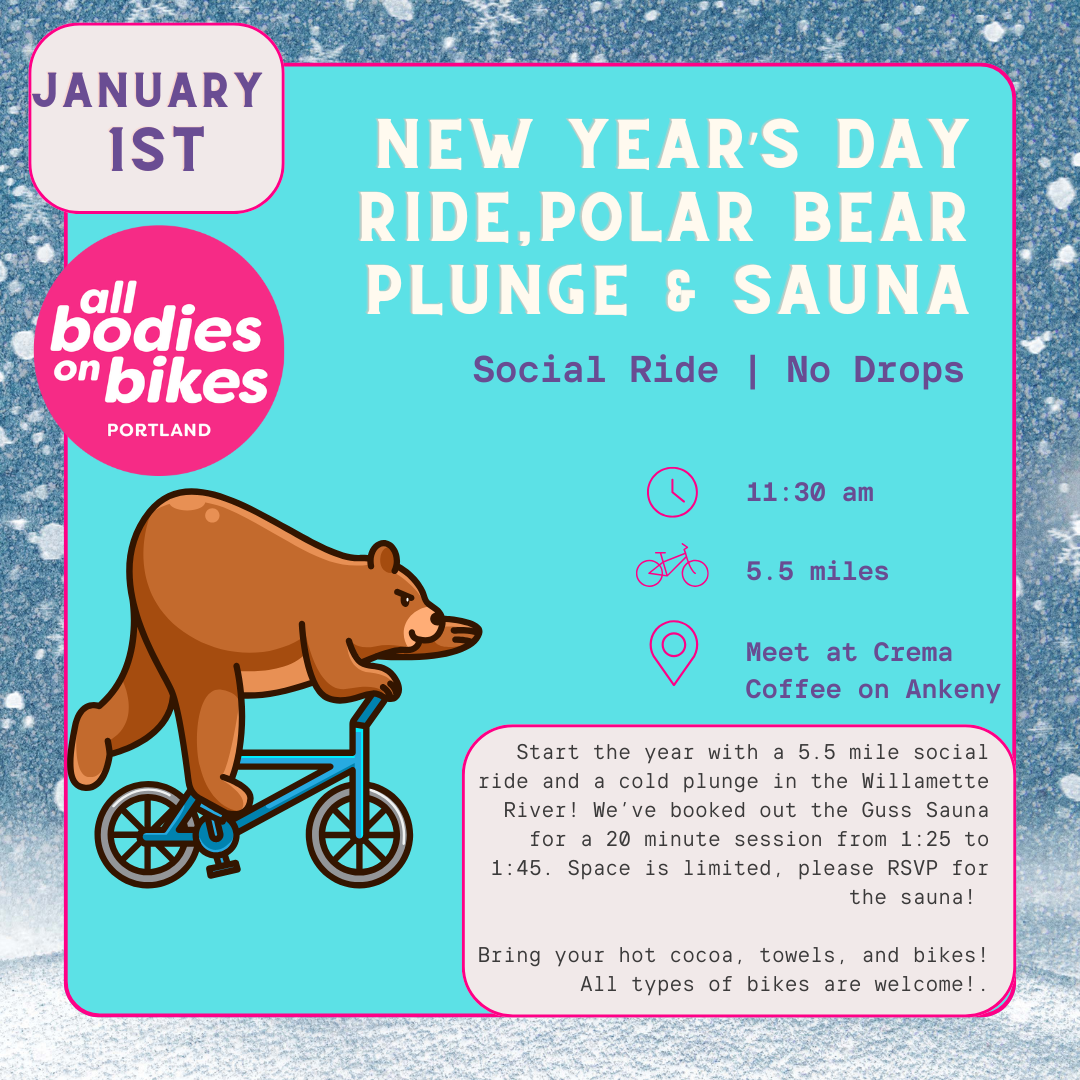 Start the year with a 5.5 mile social ride and a cold plunge in the Willamette River! âMeet at Crema Coffee on SE Ankeny at 11:30am for a 12pm rollout. We'll ride 5.5 miles down the Springwater Corridor, ending at Sellwood Riverfront Park where anyone who wants can jump in the river! âAfter your plunge, warm up in the Guss Sauna, which we've booked for our group from 1:25 to 1:45pm. Space is limited in the sauna to 12 participants. RSVP and paid ticket ($20) required for the sauna session (RSVP here: https://luma.com/uqsxz2fl) âExpect a casual pace ride, no more than 10mph. All types of bikes and riders are welcome, including kids on cargo bikes, e-bikes, and adaptive bicycles. Starting Location: Crema Coffee, 2728 SE Ankeny St, Portland, OR 97214
