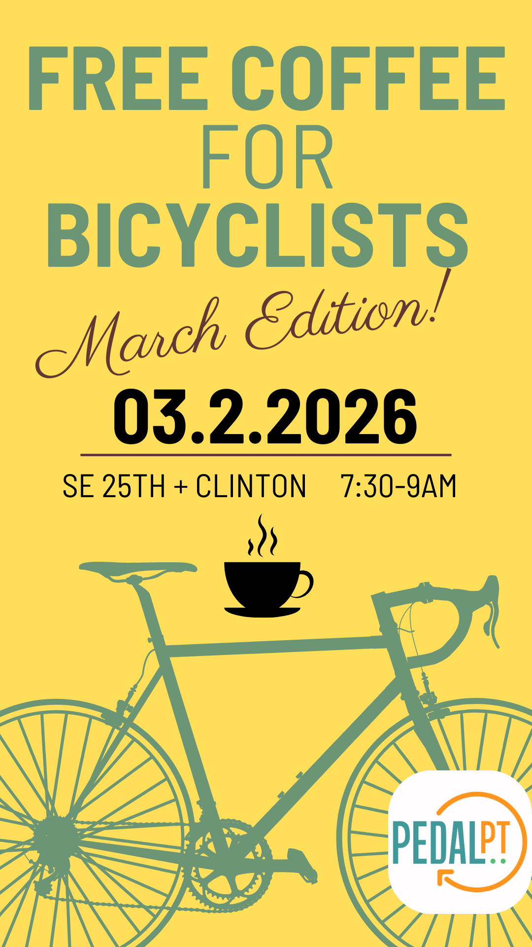 It's that time of the month for our Free Coffee for Bicyclists to brighten + caffeinate your morning bike commute down SE Clintonâ Come join us on Monday 3/2 for free coffee, high fives, and good vibes with the Pedal PT team on SE 25th and Clinton.