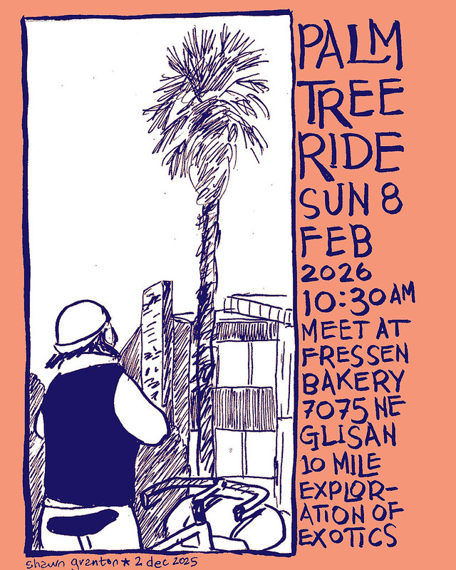The premise, as it has been since 2005, is the same: An approximately 10 mile casual bicycle ride (not a loop) exploring the palm trees around town, with some other exotics and evergreens thrown in, like eucalyptus, madronas, yuccas, Oregon myrtles, and more. These trees and shrubs keep the city green through our grey and cool winter months, when all the deciduous trees have dropped their leaves. Seeing a bunch of them in the middle of winter brightens the mood, and reminds us that winter here may not be as bad as we feel. After the ride ends there will be an option for interested folks to get food and libations. Ride will happen in good weather or a bit of rain. Heavy rain or wintry conditions can postpone this event, I'll announce any changes within 24 hours of the start time, check back here for deets.