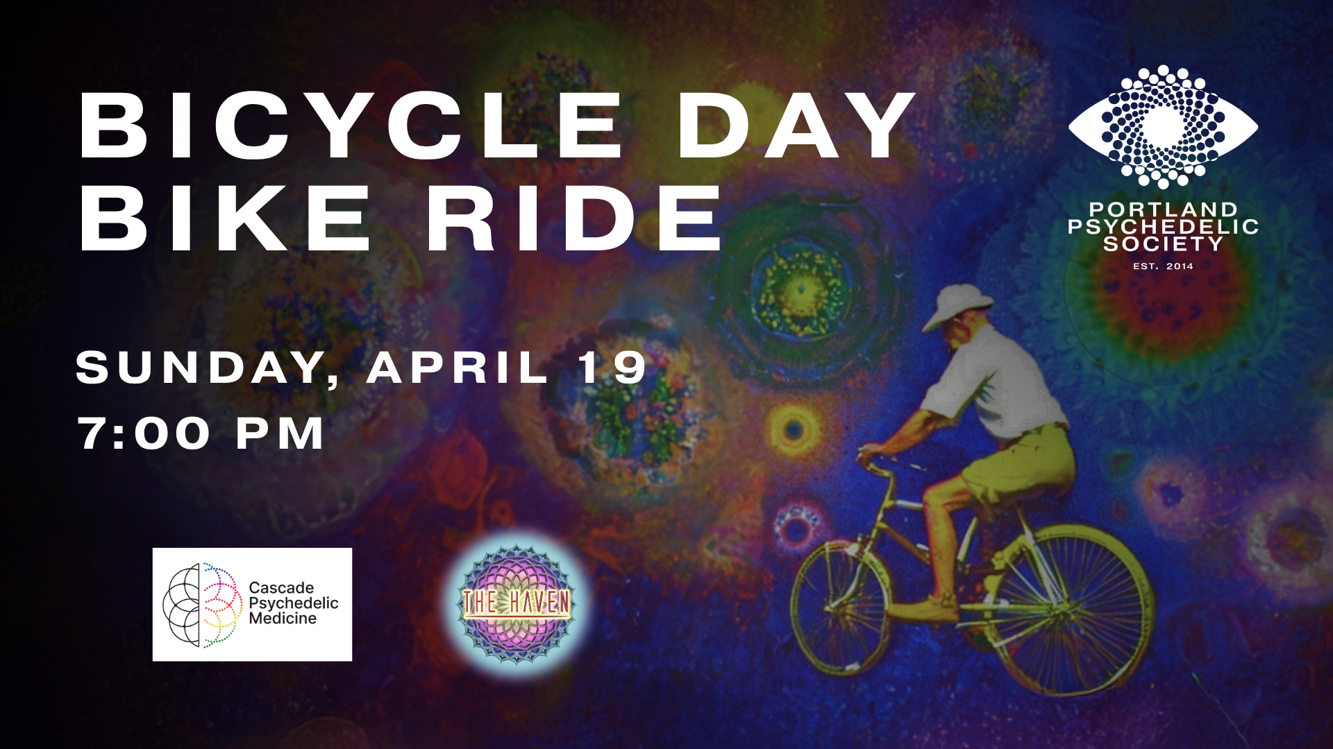 On April 19th, 1943, Albert Hofmann took a bicycle ride that changed history. To celebrate and commemorate his discovery of LSD, Portland Psychedelic Society is excited to announce a festive and inclusive group ride in honor of Bicycle Day. Join us on Sunday, April 19 at Cascade Psychedelic Medicine (2027 NE Flanders St) starting at 6:30 pm for a fun gathering to gear up for the ride and celebrate with like-minded others. Dress festively and decorate your bike! The ride will depart at 7:00 pm. Ride leaders will guide us on a carefully planned route, approximately a 90 minute gentle social ride (an 8 miles loop, including midway stop) ending at The Haven, with the option for participants to either conclude their ride or continue the celebration together. This will be an informal after party - please maintain a respectful and responsible atmosphere. **Please reach out if you would like to help lead or cork during the ride!** Exact route details will be shared with riders before we depart. This is a no-drop, easy pace ride - nobody will be left behind. Ride at your own risk and watch where you’re going. Be careful. Be sober. NO sale, distribution or solicitation of substances will be tolerated. Ride Safely! - Remember you're riding in a group so give space to those around you - Be responsible for your own safety and the safety of others - Please follow the instructions of volunteers - Speak to volunteers if you have any concerns or problems Packing List - Bright lights and color! - Snack - e.g. energy bar or piece of fruit - Helmet - Lights to get home - Waterproof layer - Inner tube or puncture repair kit - Lock to safely secure your bike at the end of the ride ************************ Portland Psychedelic Society (PPS) is a donation-based 501(c)(3) nonprofit organization. Visit our website for info about PPS memberships, volunteer opportunities, and much more. Thanks for your participation and support!