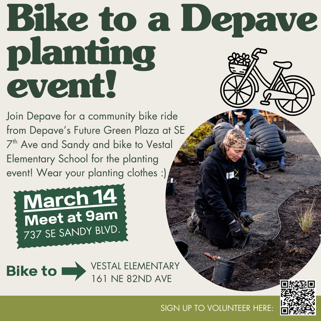 Join Depave for a community bike ride to Depave's planting at Vestal Elementary. On the bike ride, we will pause at the following locations to pickup more bikers at or after the times noted. - 9:15 am: Leave from SE 7th & Sandy - 9:25 am: Ankeny Rainbow Plaza (btwn 27/28th) - 9:30 am: Laurelhurst Park (near restrooms on Ankeny) - 9:40: NE 58th & Everett Wear your planting clothes & bike helmet. Bring a bike lock and water.