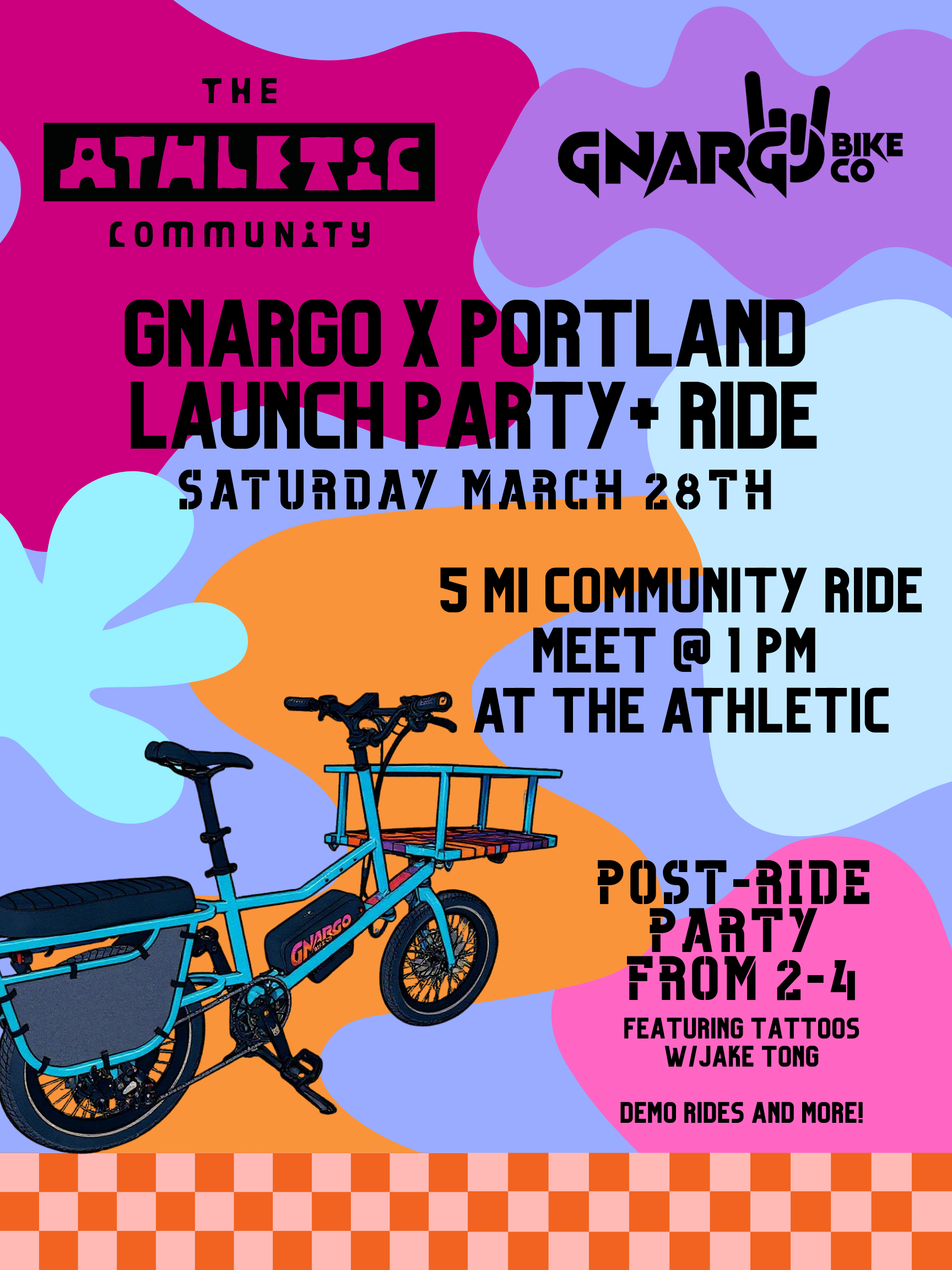 Handmade cargo bike company Gnargo Bike Company is launching in Portland! Join us for a launch party, including a community ride, flash tattoos by Jake Tong, test rides, and meet the owners! Ride: Meet at The Athletic at 1pm for a 5 mile, social ride. We'll loop back and end at The Athletic for a party! Get to know the Gnargo Bikes here: gnargobikeco.com