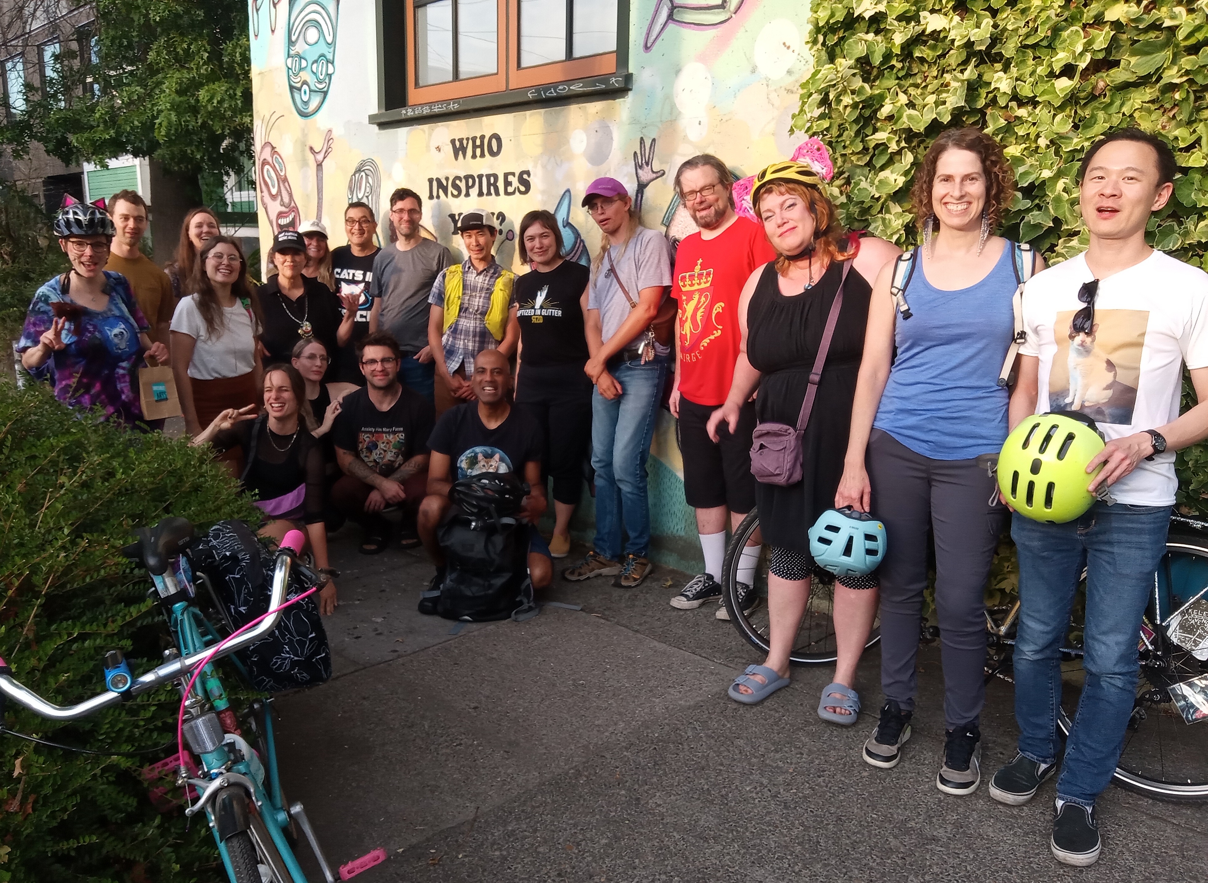 We meet up every other Tuesday. We ride in the Southeast Portland we have food carts and a beer tent at the start of the ride. And we go somewhere and generally have a fire. As a great close-knit ride open to you . i promise to make you dance like idot and celebrate your night.So be kind to all travlers , bring your friends, and optimism.