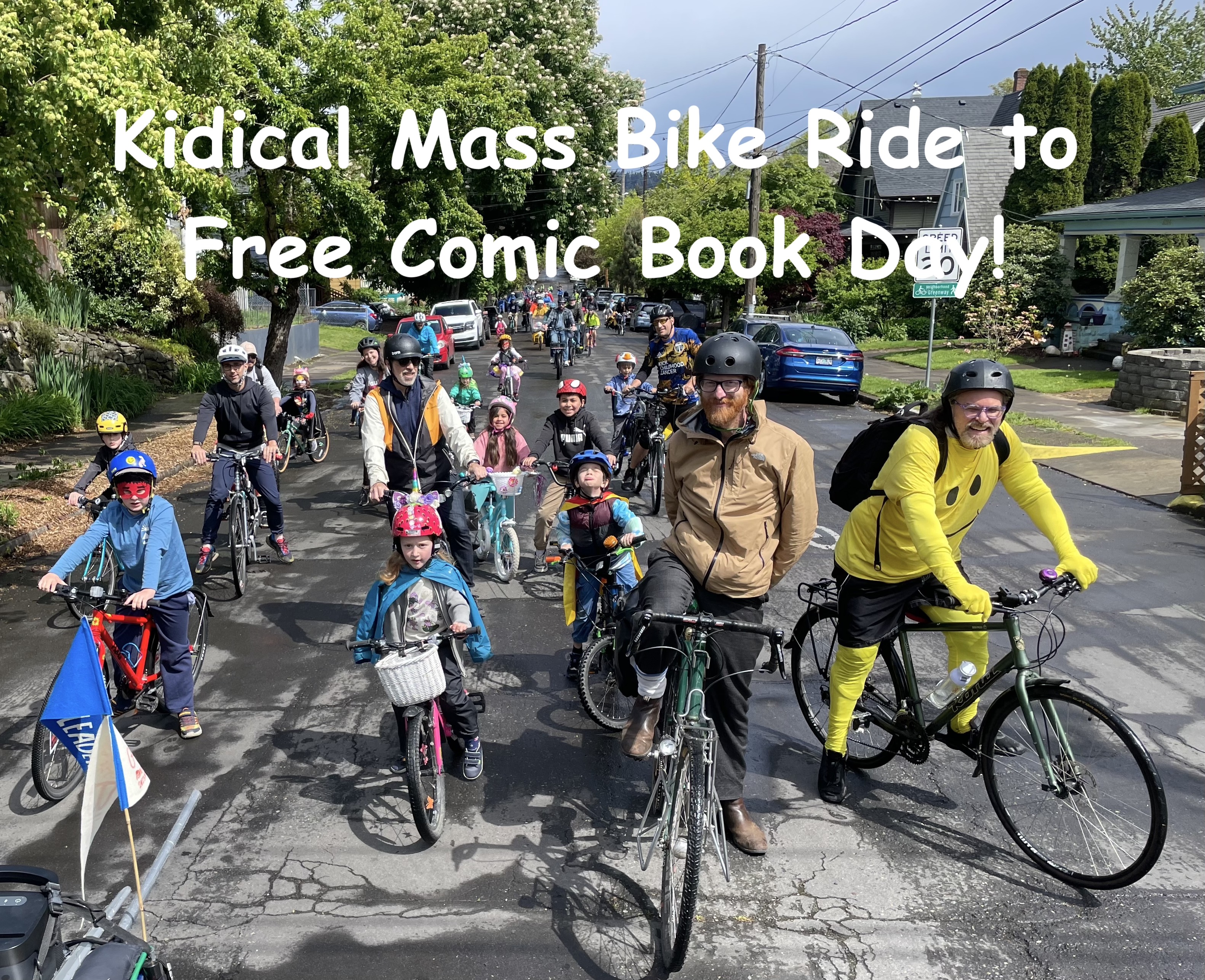Ride bikes around SE Portland with Kidical Mass! Put on your superhero costume to celebrate Free Comic Book Day with a family-friendly bike ride to our favorite comic shop. Weāll ride from the Sunnnyside School playground to Books With Pictures across from Abernethy School on neighborhood greenways and quiet streets, while listening to superhero music. This is a free event, and kids can get free sample comics! But you might want to bring money buy a book or snack at the food cart behind the shop. Your ride leaders will be dressing up as comic book superheros, but you can also be any kind of comic character or just ride as you are. The ride is a loop, 2 miles each way with a break at the comic shop and food carts in the middle, so itās suitable for most young bike riders who can pedal their own bike. We ride at a moderate pace for little pedalers and parents on cargo bikes. Kids should wear a helmet, be able to ride in a straight line without training wheels, start and stop. Cargo bikes, tandems, trailers and tag-a-longs are great for kids who havenāt learned to pedal. Corker are welcome to be a traffic safety superhero. Weāll ride together as a group, rain or shine, because kids are traffic too! Route: https://ridewithgps.com/routes/46251769