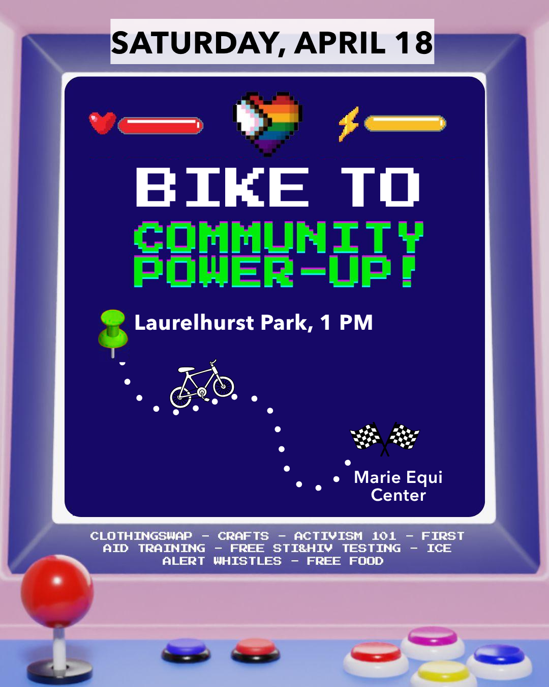 🚲🌈 Ride to the Community Power-Up! Meet at 1pm, ride at 1:30 Laurelhurst Park (Picnic area E or F) The meeting spot: the Wild Rose Resistance Choir is having a potluck from 11-2. Get there early if you want to join! The end spot: a free community event designed for queer & trans community, resource sharing, and finding your role in resisting fascism. There will be a clothing swap, protest safety and activist 101 trainings, FREE food from @jawaherpdx, FREE sketch portraits by @lindzenatordraws, FREE STI & HIV testing, 🧊 whistle kits, and lots of mutual aid and queer community groups to meet. 😷 masks are required for the Community Power-Up, not the bike ride All ages welcome